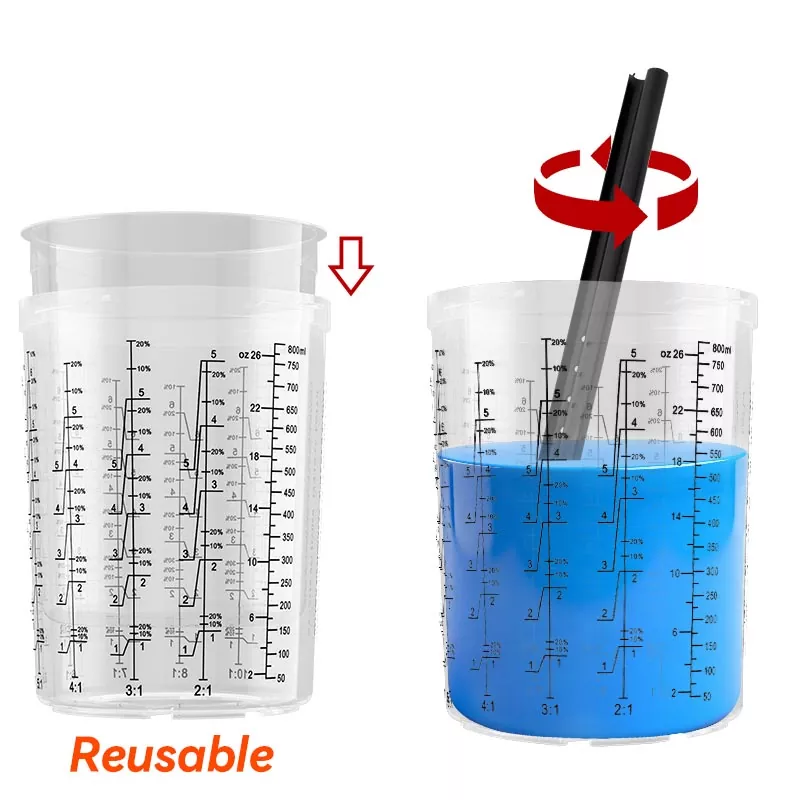 Genanvendelig ydre kop med blandingsforhold skala. Indsæt engangsforingen i den ydre kop og bland malingen direkte i foringen. Reducer materialeomkostningerne ved ikke at bruge en traditionel blandekop.