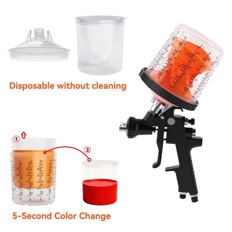 Deengangs sprøjtepistol kop kræver ingen rengøring efter brug; kassér blot den indvendige kop for hurtigt at skifte farver, reducere farveskiftintervallet fra 20 minutter til 5 sekunder, hvilket effektivt fordobler den daglige produktion. Låget har et indbygget fint filter til effektivt at filtrere urenheder, hvilket sikrer en ensartet og glat spray, hvilket resulterer i en finish af højere kvalitet.