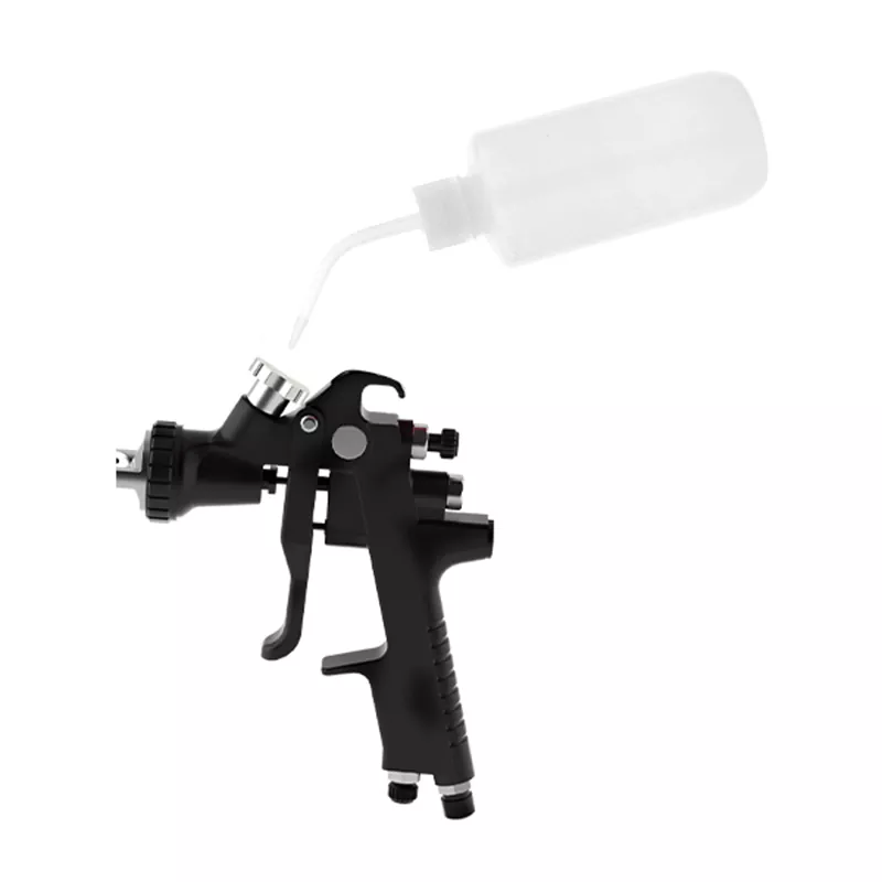 Den unikke buede dyse på sprøjtepistolens rengøringsflaske kan hurtigt skylle den resterende maling i hullerne dybt inde i spraypistolen, som effektivt kan forhindre blokering forårsaget af malingstørring, forlænge levetiden for spraypistolen og minimere tiden til at adskille spraypistolen til rengøring.